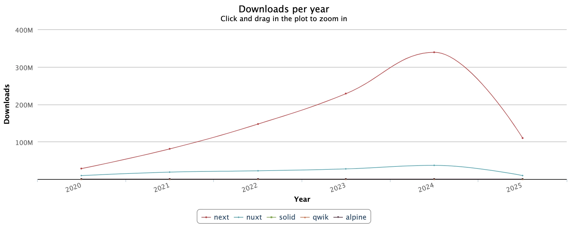 Moreover, here are the front end framework downloads per year. Hint: React, Vue and Svelte have the most downloads in 2025: